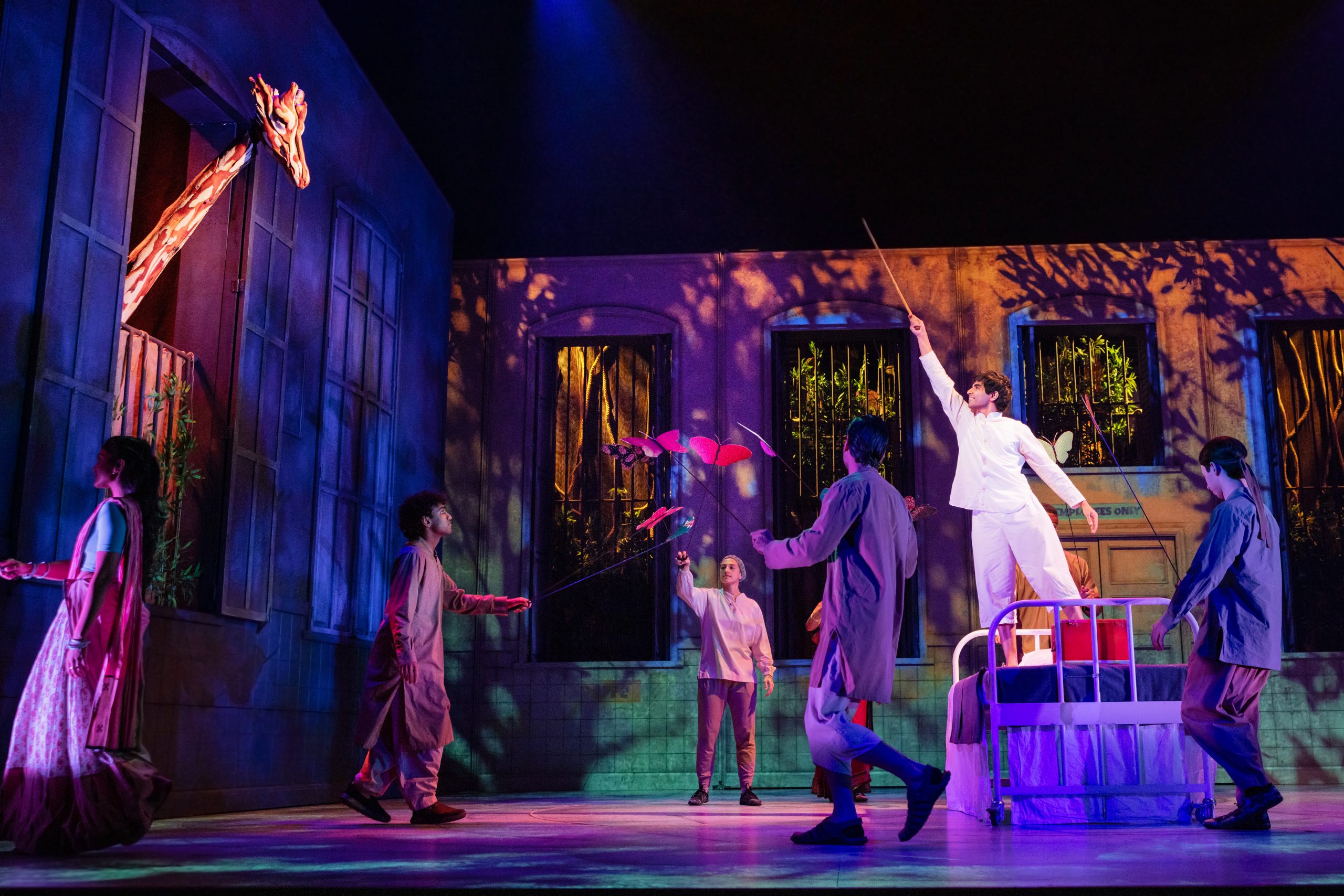 The play toggles back and forth between the hospitalized teen telling the story and the events takes place before and during the shipwreck and ocean journey. Pi begins his story in happy times in India, where his family run a zoo in a national park. Pi’s full name is Piscine, French for pool, which was conferred by an uncle (Rishi Jaiswal) a swimming enthusiast who spent time in France. To avoid having his name shortened by kids at school to “Pis” or worse, he calls himself Pi, referencing the mathematical number that starts 3.14.