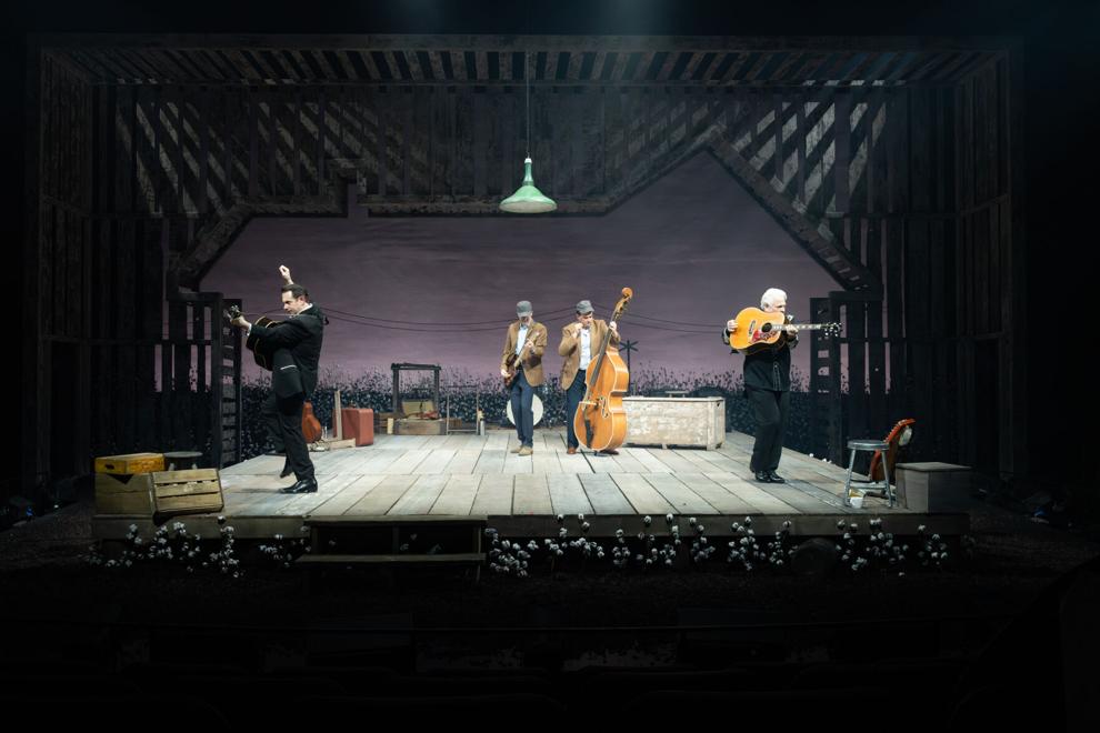 The Repertory Theater of St. Louis closes out an outstanding 2025-2026 season with a high-energy, crowd-pleasing musical production. “Ring of Fire” is neither a musical nor a concert nor a biography, but a show that straddles all three of those descriptions. The show begins with an older Johnny Cash, in the form of a character named Marshall (Eric Scott Anthony), looking back on his life and his music. As he remembers, he has his guitar in hand, as people from his past (and his younger self” gather on the stage, and start to play and jam, what becomes a biographical medley of Cash’s hits and other songs. While the Marshall character moves in and out of the performances on stage, he narates a lightly-sketched tale of Johnny Cash’s life and music, more like highlights and memories than a biography. Mostly, Johnny Cash’s life and career are told through songs.
